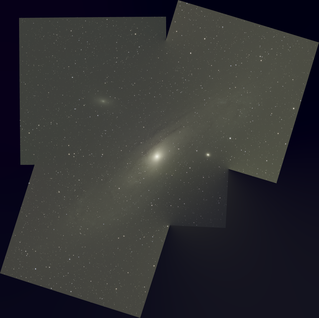 So, here is the result of putting the mosaic together, and you can clearly see there is a gap in the bottom right hand side. I have subsequently added another panel to the sequence in NINA and will add that in to the mix, along with a panel centered on the core of the galaxy itself. The image will be huge (both in terms of pixels and memory) until I figure out the best crop.